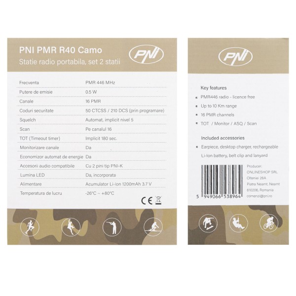 Prenosna radijska postaja PNI PMR R40 Camo, komplet z 2 kosoma, 0,5 W, 16 programabilnih kanalov, 16 PMR in 50 CTCSS in 104 DCS toni, ASQ, TOT, monitor, programabilen, baterije 1200mAh, polnilci in slušalke priložene