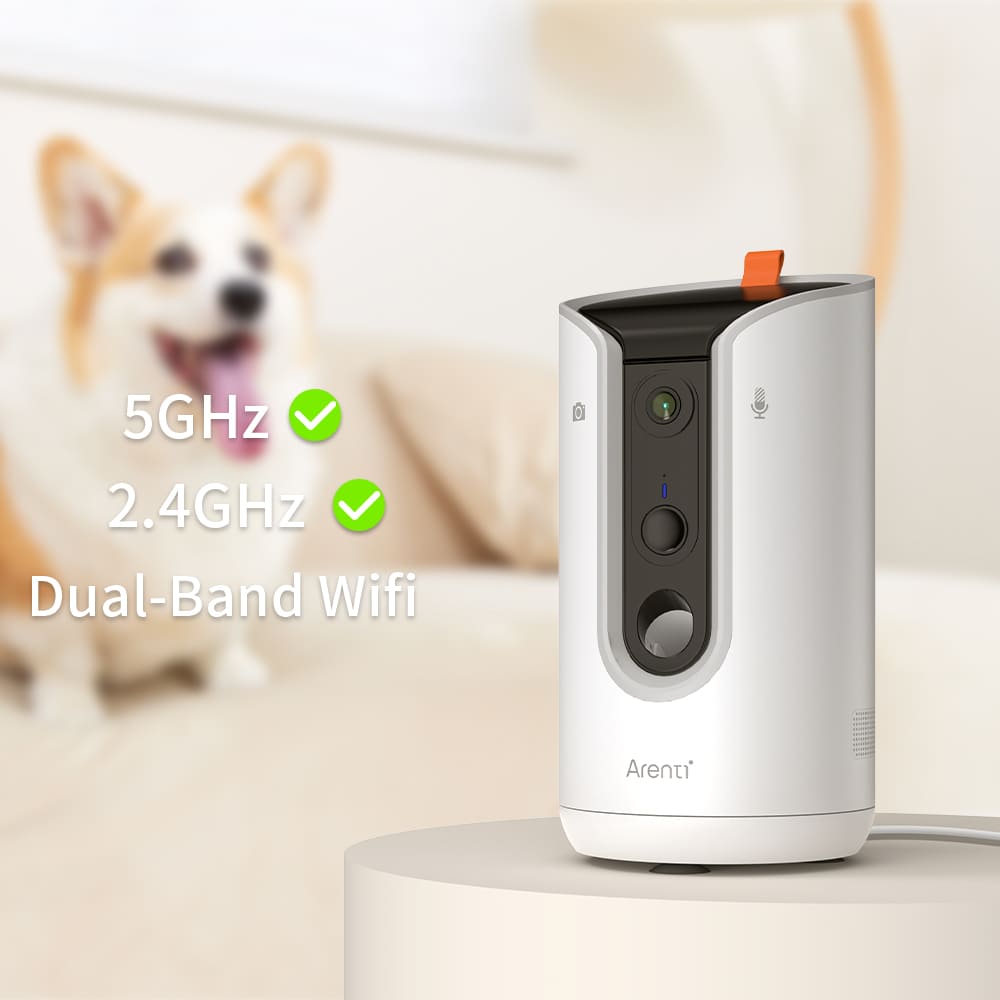 Najboljša notranja Wi-Fi kamera ostane vedno povezana. Pasja kamera Arenti podpira Wi-Fi povezave 2,4 in 5 GHz, kar zagotavlja nemoteno delovanje in stabilno, neprekinjeno povezavo, ne glede na vrsto usmerjevalnika.