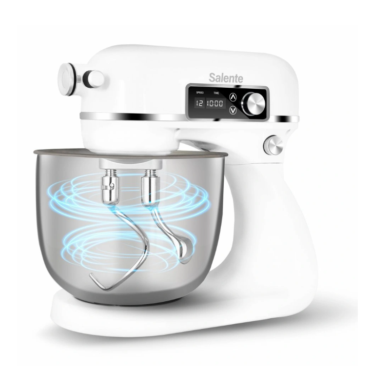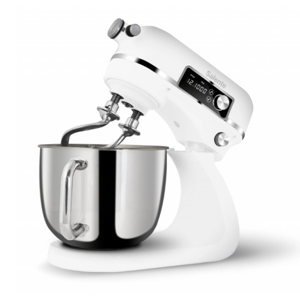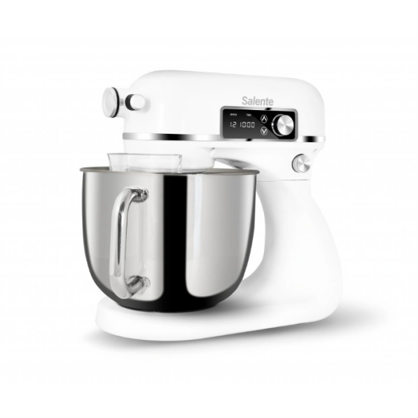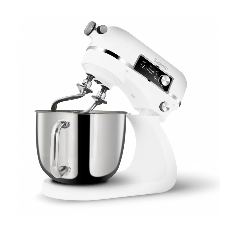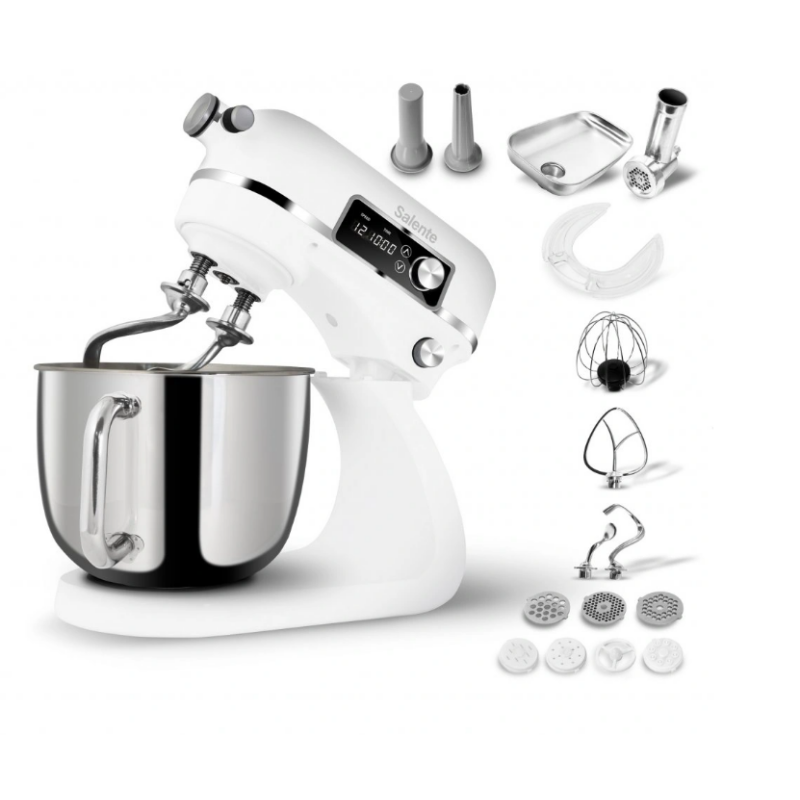 Stoječi mešalnik Salente DigiChef+ ni le kulinarični mojster, temveč se ponaša tudi s premium kovinsko zasnovo in elegantno belo površino . Njegovo robustno ohišje je v celoti izdelano iz aluminija (tako kot mlinček za meso), zaradi česar je popolna kombinacija vzdržljivosti in stila.