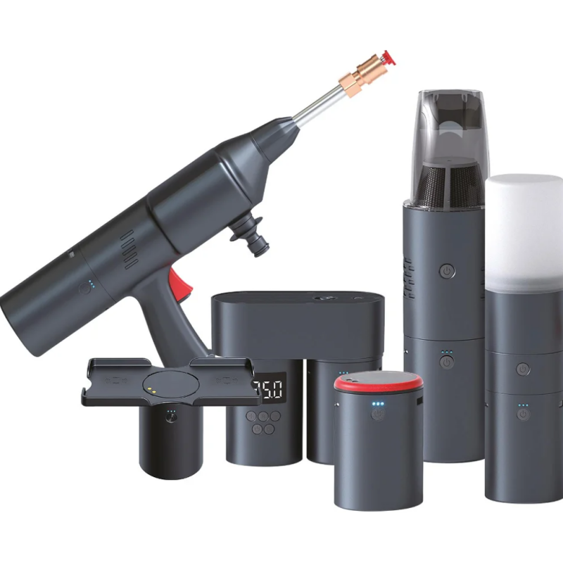 - Vključuje baterijo, polnilec, črpalko, prenosni sesalnik, visokotlačni čistilnik in svetilko