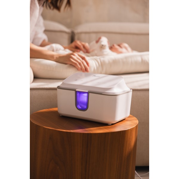 Grelnik WarmWipes je opremljen z napredno tehnologijo UV sterilizacije, ki zagotavlja varnost vašega otroka z odstranjevanjem bakterij in mikrobov. Ta funkcija ne samo, da robčke ohranja popolnoma čiste, temveč omogoča tudi razkuževanje majhnih pripomočkov, kot so dude in žličke, zaradi česar je vsestransko orodje v domu vsakega starša. Je bistveni del vsakega kompleta, ki zagotavlja higieno in brezskrbnost.
