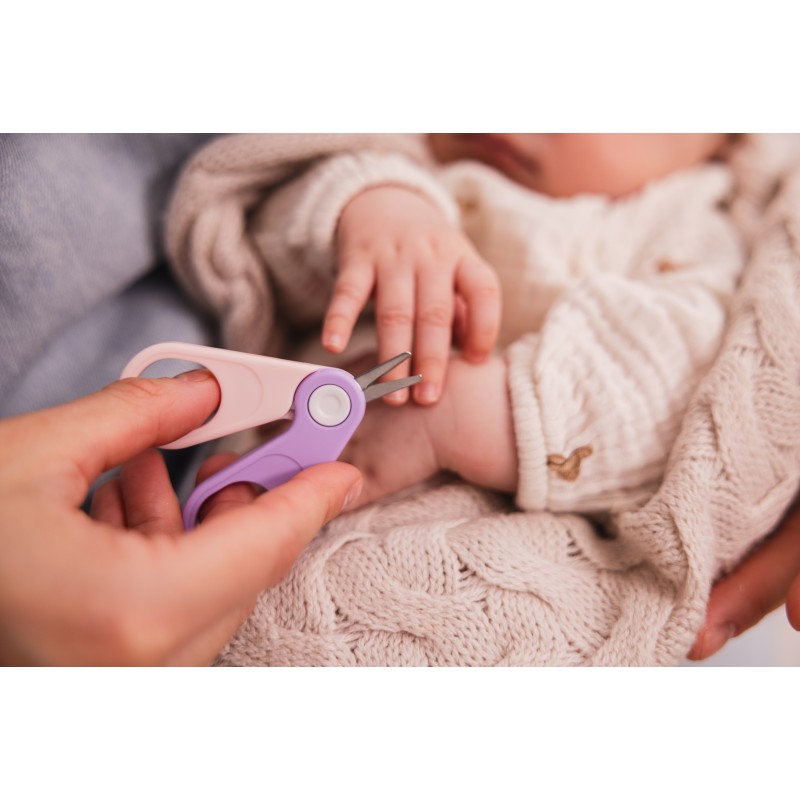 Elementi seta so opremljeni z zaobljenimi robovi, kar zmanjšuje tveganje nenamernih ureznin in draženja. Škarje imajo posebne konice, ki ščitijo nežno dojenčkovo kožo. Ščipalnik za nohte z nedrsečim ročajem ima 8 mm ukrivljeno površino, ki omogoča natančno in varno striženje nohtov. Steklena pilica odlično zgladi robove nohtov in prepreči naključne praske na majhnih rokah, npr. pinceta z mehko konico je odlična za nežno odstranjevanje tujkov iz nosu, ušes ali popka.